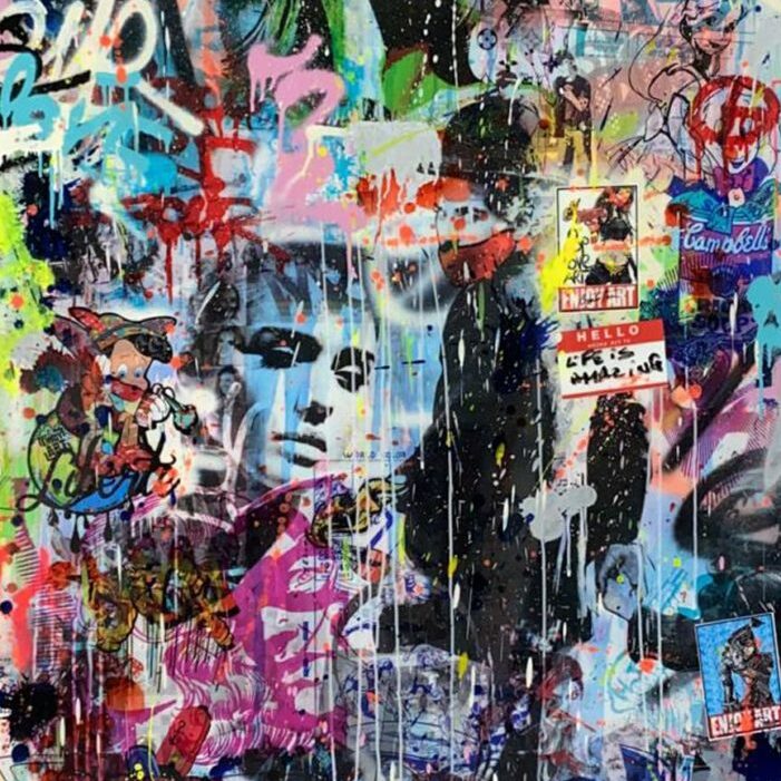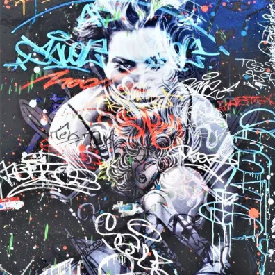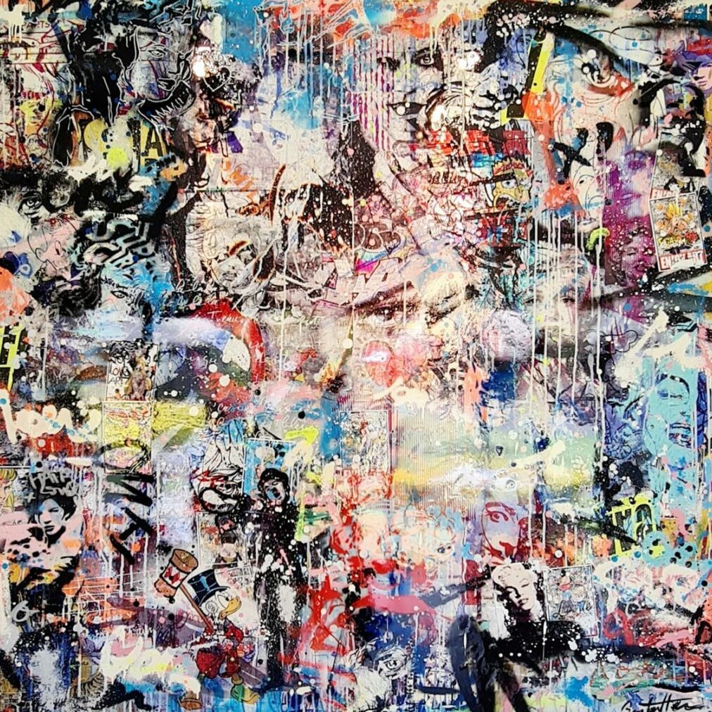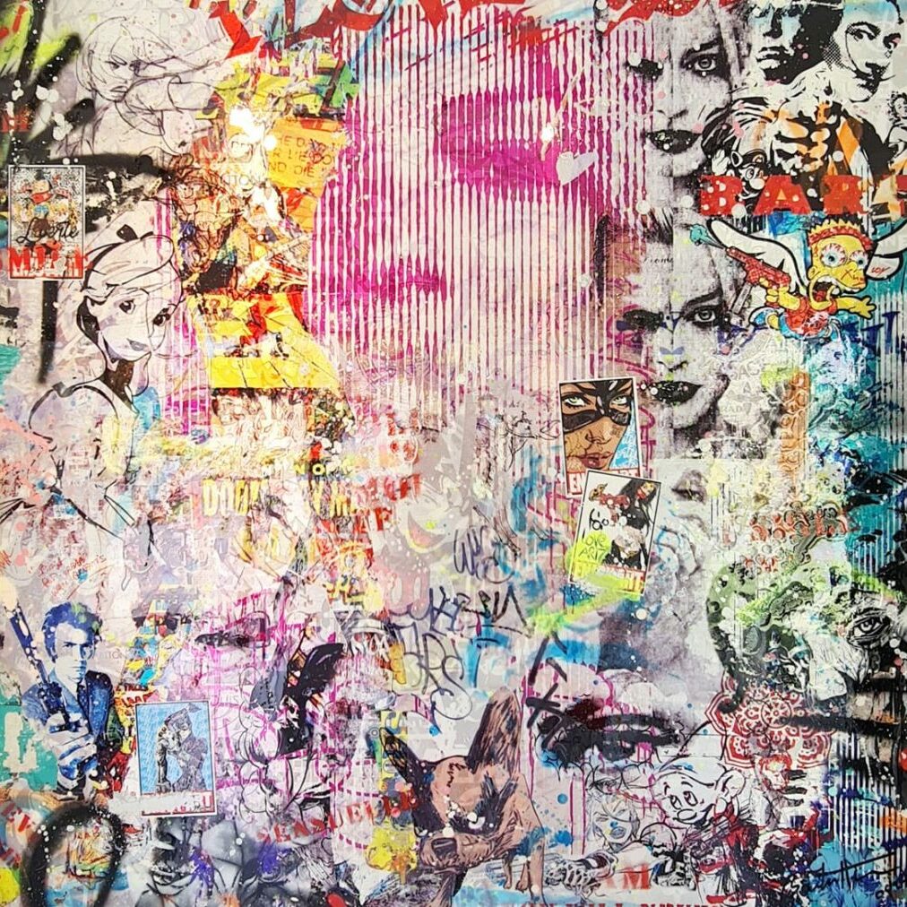 Prêt à déclencher à la moindre singularité visuelle qui pourrait jaillir de son environnement urbain. Cette veille, ce glanage de ressources graphiques lui permet de saisir à l’envie une étrange coulure sur un mur, une tache singulière sur le macadam, de ramasser un morceau de poster dont la forme de la déchirure pourrait l’inspirer : “Les franges, la découpe d’un papier peuvent parfois justifier un bon coup de frein à main”, s’amuse l’artiste. Notes griffonnées, pigments par centaines, cartes de stockage de données numériques, art books au kilo, carnets encrés, monographies ou affiches de cirque en tournée. Entre souvenirs et outils d’avenirs, l’atelier de Cédric Bouteiller est empli d’objets pour créer. composite, entre deux époques et plusieurs continents, son bric-à-brac est nécessaire. L’accumulation lui sert à faire monter les matières, naître les idées. Ici, un encrier chinois en porcelaine, là une armoire vitrée pleine d’énormes marqueurs. Au sol, de petits lacs et étangs laissés par la résine sèche…