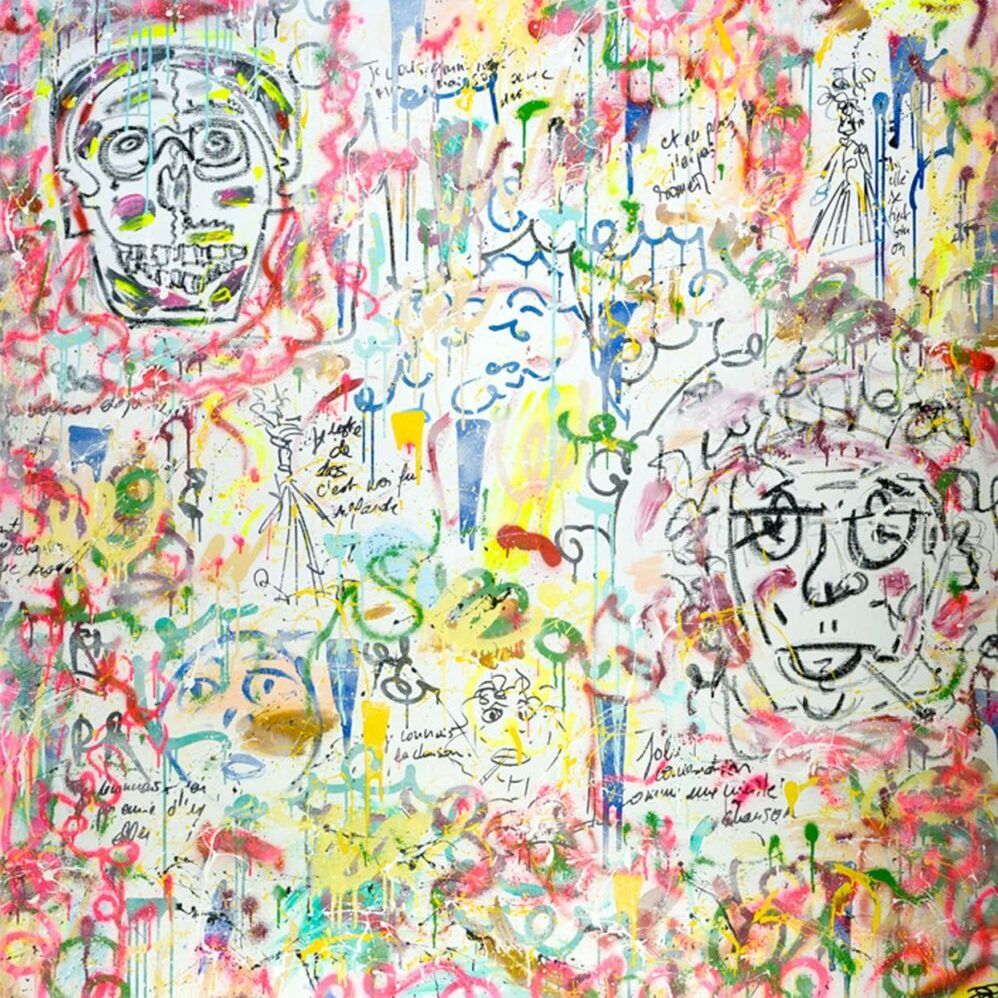 On connaît de son travail les grands formats composés de projections d’acrylique aux couleurs vives, joyeuses et denses, taguées d’injonctions en anglais qui pourraient être des bouts de dialogues sortis d’une série américaine ou le refrain d’un morceau de rap, reflet urbain et occidental repris de l’air du temps avec humour et bonne humeur. On connaît moins ses suites de dessins caricaturant les nanas avec tendresse comme dans une bande dessinée où la musique et les mots s’encastreraient dans un casting à la Woody Allen. Deborah Sportes s’attaque à tout support, que ce soit le papier, la toile, le vêtement ou le cahier, la palissade ou le mur ; du rugueux au souple, Deborah Sportes dompte ou apprivoise ce qui lui passe sous la main avec une énergie qui devient force par la joie des couleurs, leurs entrelacs denses et épais qui font penser aux grands aplats de la grande Joan Mitchell qu’elle admire.