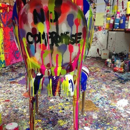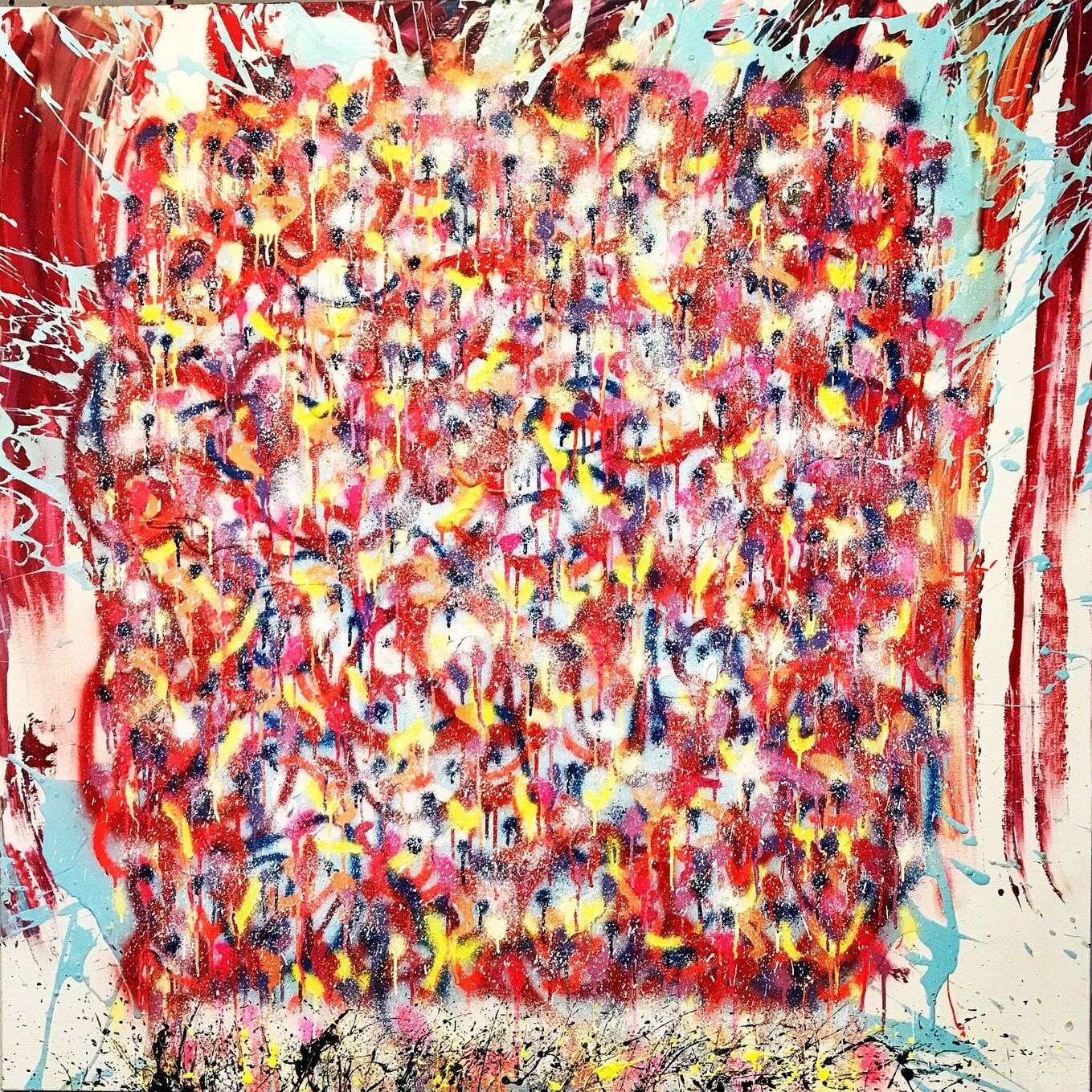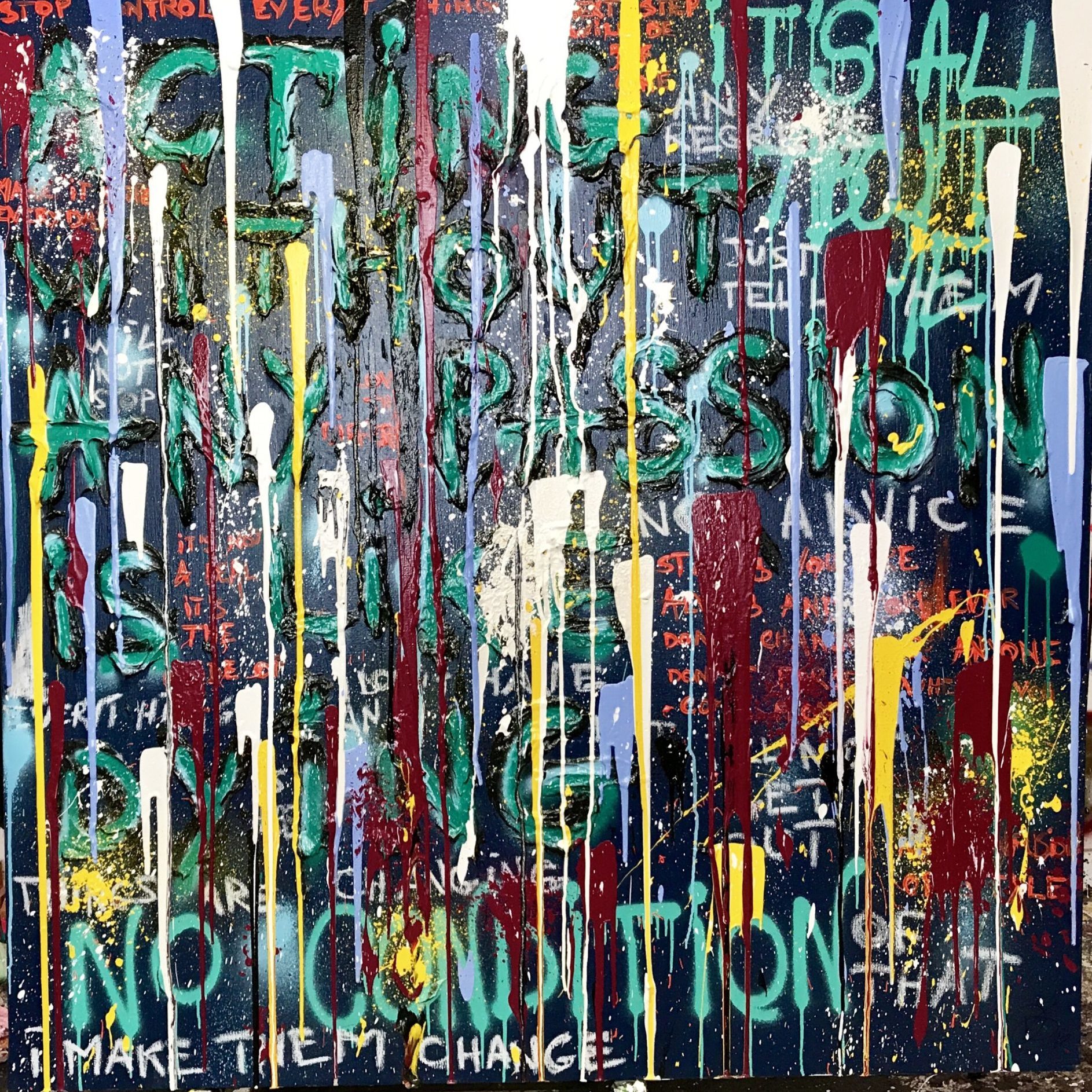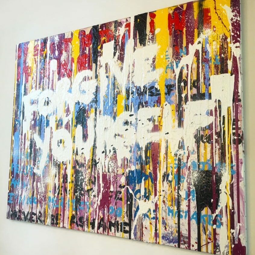 Mais le travail de Deborah Sportes est autre et bien personnel. La projection acrylique se contredit, les couleurs s’entremêlent dans un filet serré et violent et les mots réapparaissent, violents et destructeurs. Le spectateur reste suffoqué et peut comprendre que derrière cette harmonie vive surgissent des amas plus complexes, des déchirures béantes et douloureuses.