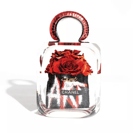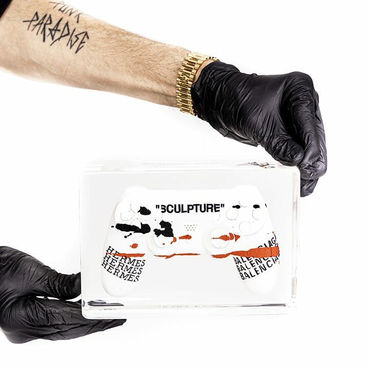 Cristallisant pour l’éternité de véritables objets dans une résine translucide, le sculpteur nous emporte dans son atmosphère « PUNK PARADISE », 100% rock, chic et addictive.