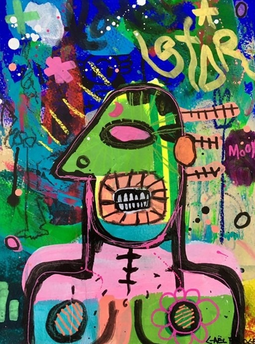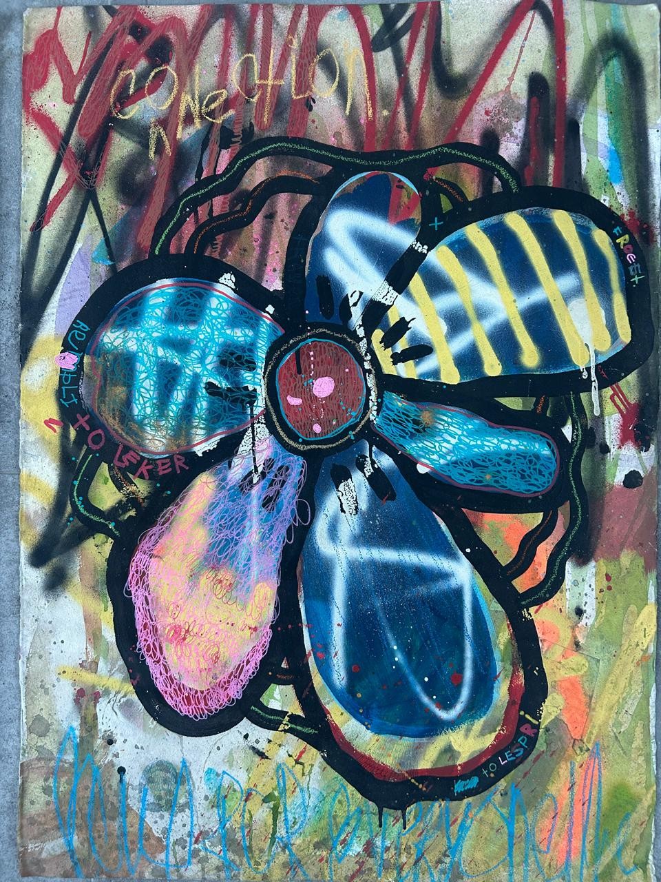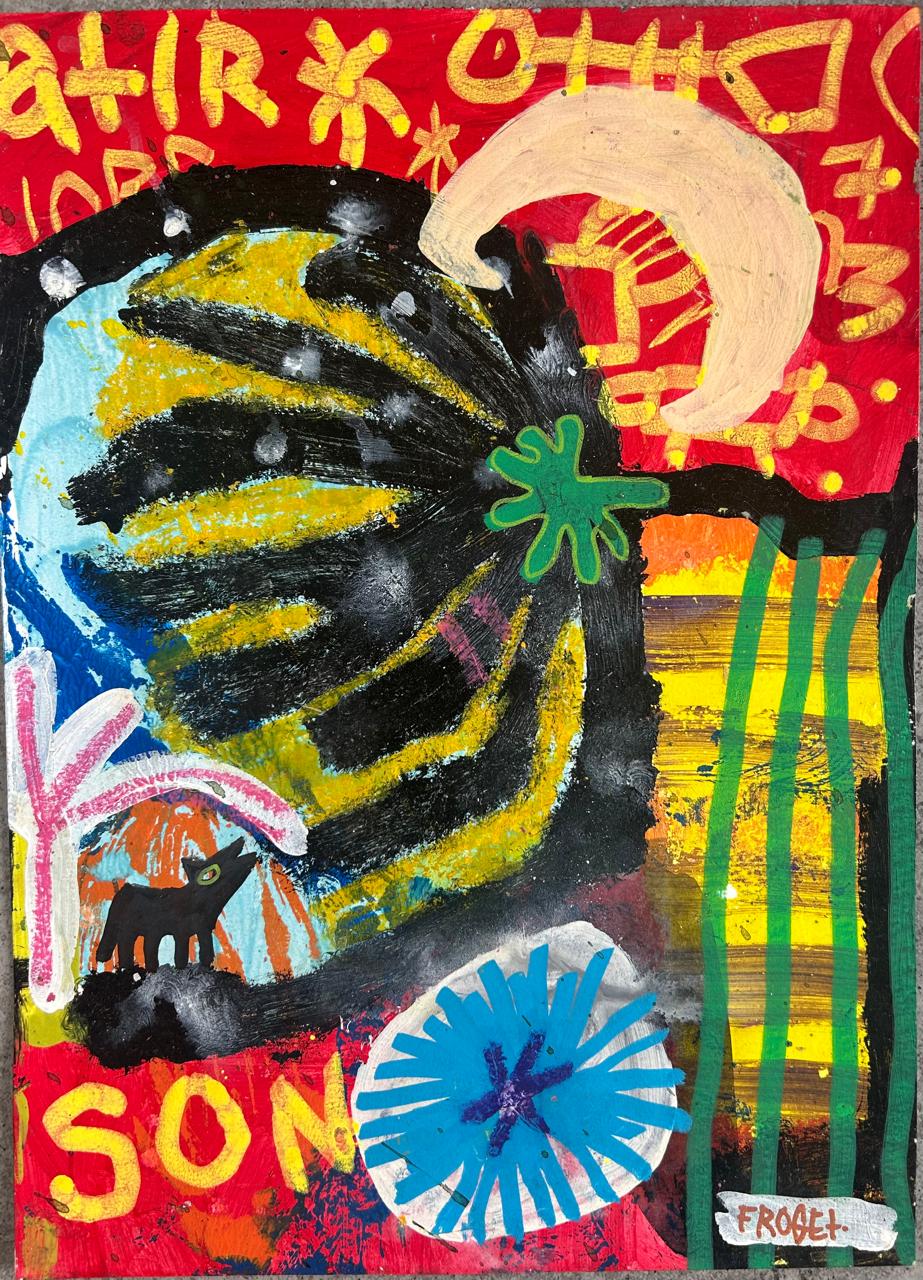 Gaël Froget, artiste mauricien né en 1986, s’impose comme une figure singulière de la scène contemporaine de l’océan Indien. Formé initialement à la mode à Kuala Lumpur et passé par une prestigieuse Maison de couture, il conserve de cet univers une liberté créative et un dynamisme qui irriguent profondément son travail artistique. Autodidacte en arts visuels, Gaël apporte fraîcheur et audace à la création mauricienne, renouvelant les codes par des choix techniques et esthétiques résolument singuliers. Ses œuvres mêlent peinture acrylique, aérosol, textiles et collages dans des compositions où rien n’est figé. Chaque création devient un espace de liberté totale, travaillée en mouvement, parfois même foulée aux pieds dans un geste rituel qui signe physiquement son empreinte au-delà du nom.