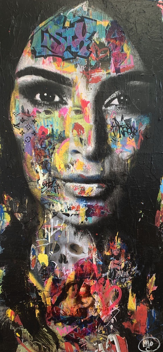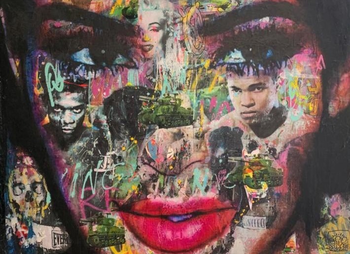 Maria De Campos, artiste peintre portugaise née en 1977, vit et crée aujourd’hui dans la Drôme, en France, où elle développe un univers pictural à la croisée du Pop art, du Street art et de l’expressionnisme. Formée à l’École Régionale des Beaux-Arts de Valence, elle se passionne pour les arts visuels et l’imagerie contemporaine, faisant des grandes icônes du XXe siècle son motif principal et récurrent. Portraits d’hommes, de femmes et même d’animaux célèbres sont retravaillés par la couleur dans des compositions où collage et dripping (superposition de teintes éclatantes) servent une quête esthétique autant qu’intellectuelle. Travaillant inlassablement la matière et la couleur, Maria cherche à surprendre, éveiller la réflexion et briser les clichés que chacun peut porter sur ces personnalités. Ses toiles, indéniablement contemporaines et actuelles, subliment les célébrités tout en les dissimulant derrière des couches de couleur brute et des fragments de texte, créant une tension visuelle entre révélation et occultation.