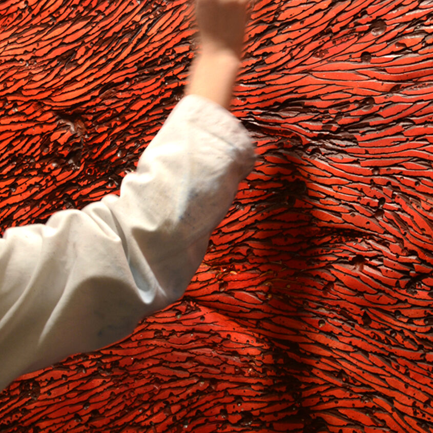 Dans ses œuvres, la main de l’Homme s’efface pour redonner place aux beautés simples de la nature et du temps. La technicité s’oublie, seule l’émotion reste. Au travers des sillons de ses tableaux sculptés, elle nous parle des premières traces de l’Homme, de l’archaïque et de l’inconscient. La ciselure propose un voyage entre infiniment grand et infiniment petit, amenant chacun entre contemplation et introspection. Face à ses œuvres abstraites, nous sommes absorbés et séduits par l’imaginaire que l’on y projette, nous nous attachons à ce que l’on croit reconnaître et nous rassure.