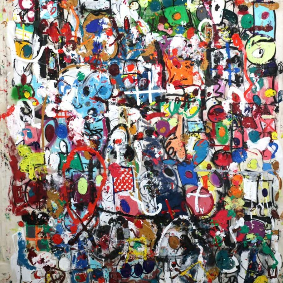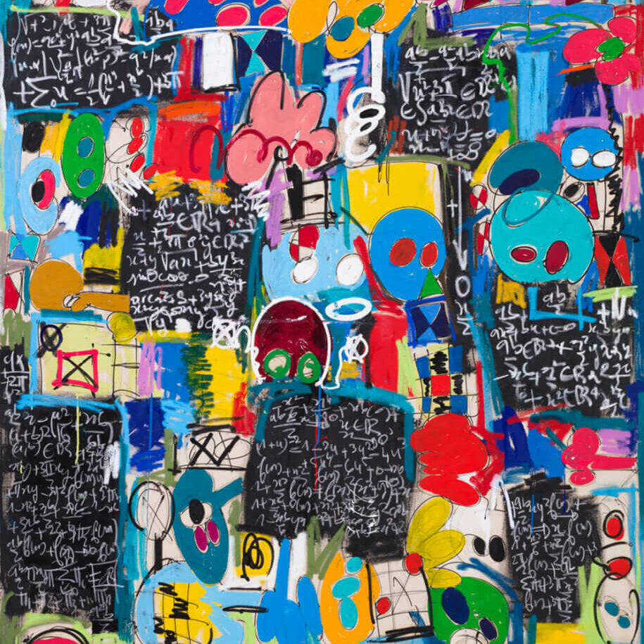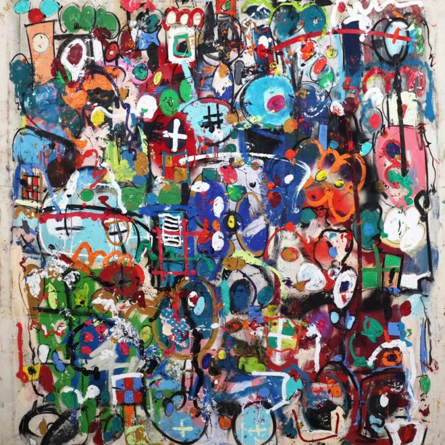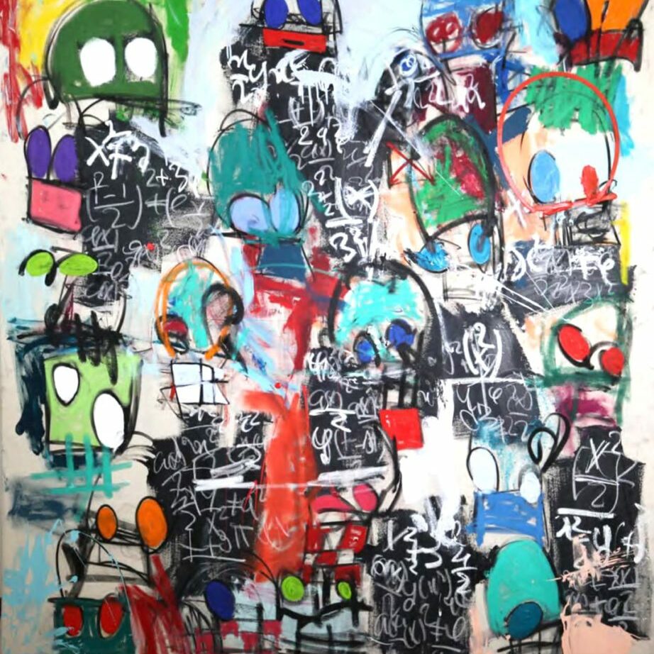 Créant un travail captivant et exigeant en technique avec une forte inspiration du mouvement d’expressionnisme abstrait des années 50 et 60, les peintures de Taher Jaoui sont de riches assemblages de formes en couches, de couleurs vibrantes, de gestes expressifs et de signes et formules mathématiques. Appliquées sur la toile à travers une interaction dynamique, un dialogue physique d’avant en arrière dans lequel la perspective et l’orientation changent continuellement jusqu’à ce que tous les éléments soient équilibrés correctement, ces créations opulentes sont la manière personnelle de l’artiste pour s’exprimer.