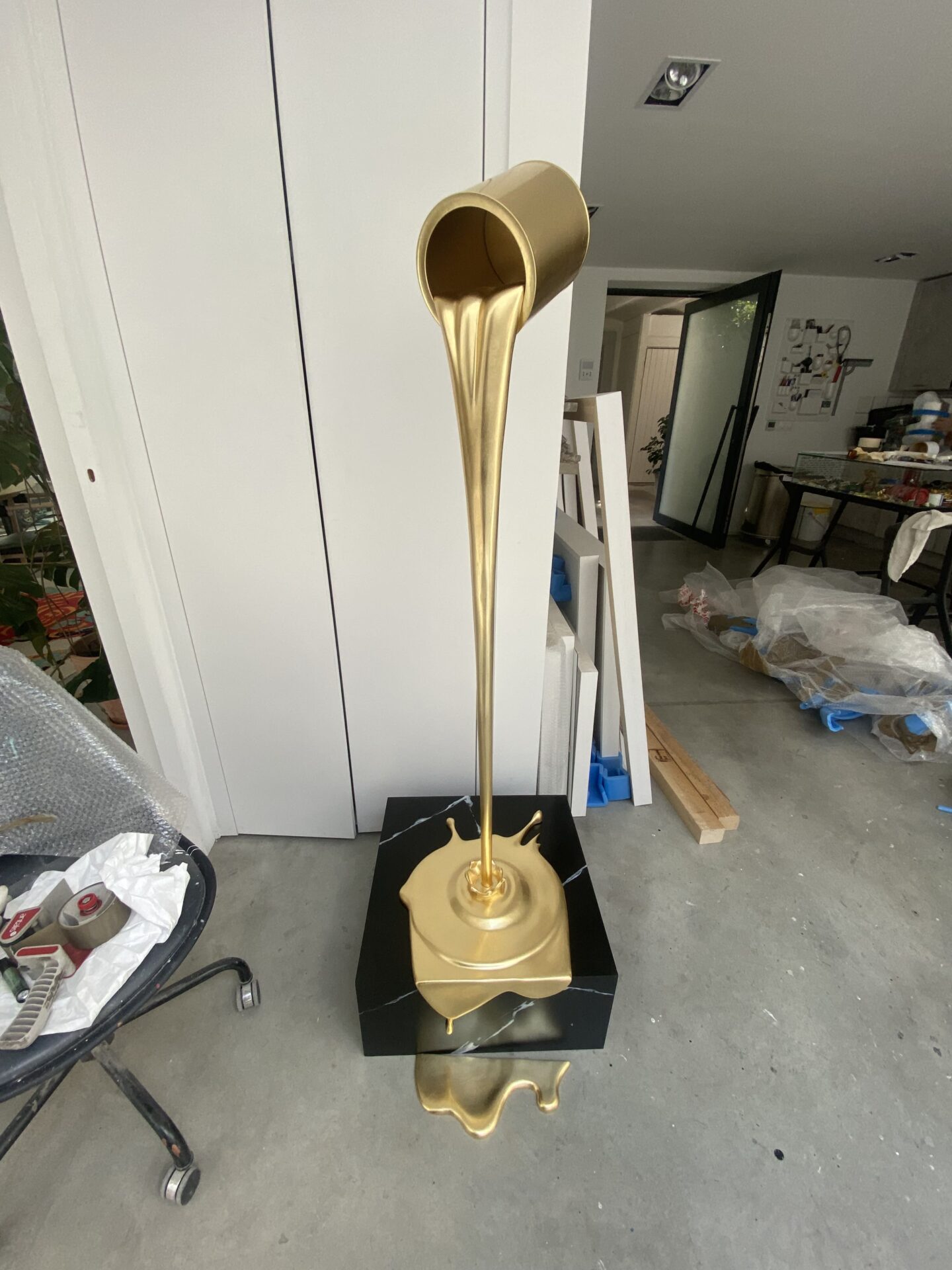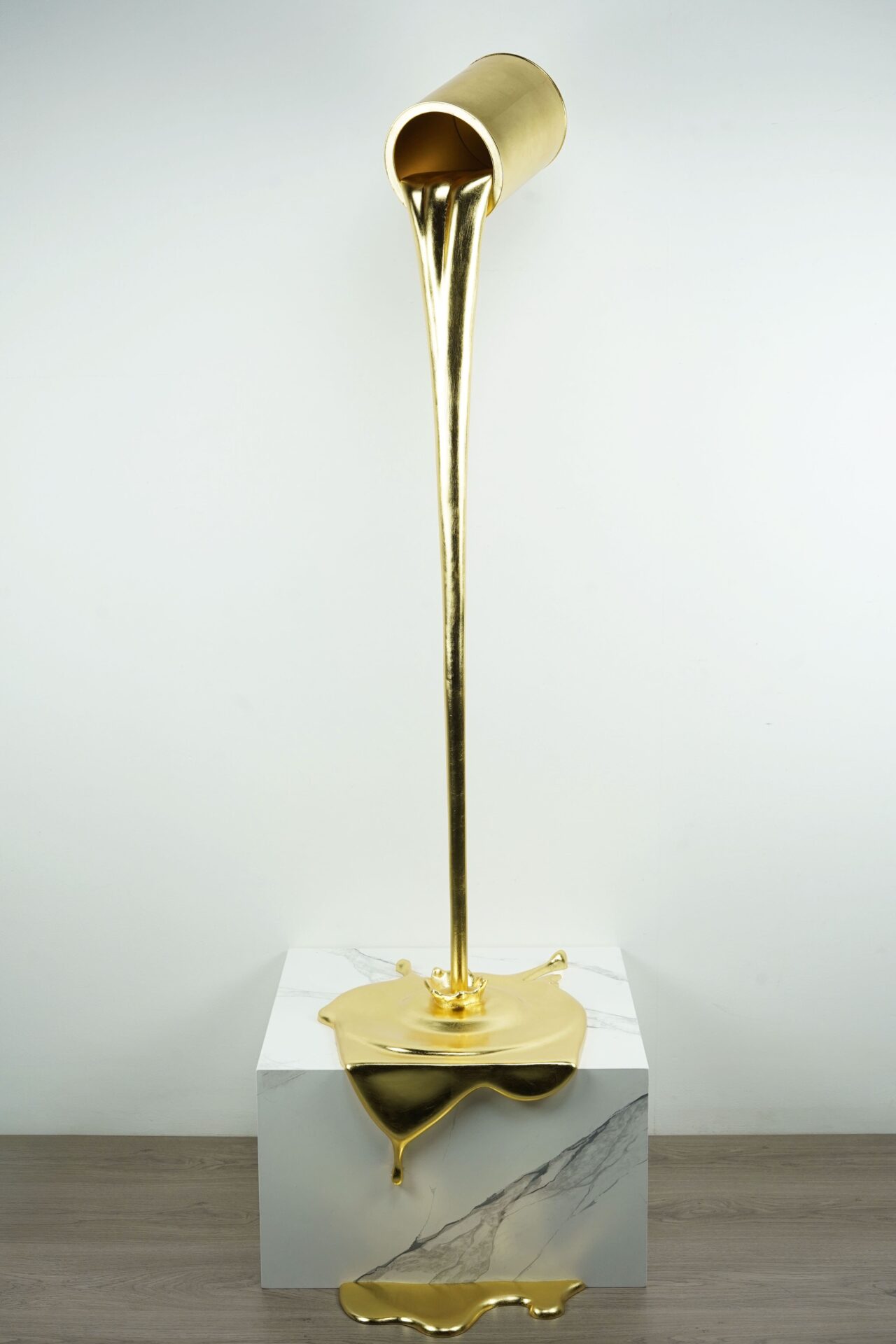 Her "Installations," monochrome and figurative productions, defy physical constraints to bring spaces to life. Gold leaf, trompe-l'oeil marble, matte white: these materials evoke the monumental and the sumptuous while questioning the codes of the past and the future. The sacred, the divine, and the infinite resonate in a paradoxical celebration of the immaterial. Freed from any notion of conventional space, her pieces literally spring toward the viewer. The "Snapshot" series takes this audacity even further, playing with technique through the deliberate distortion of stretched canvases.